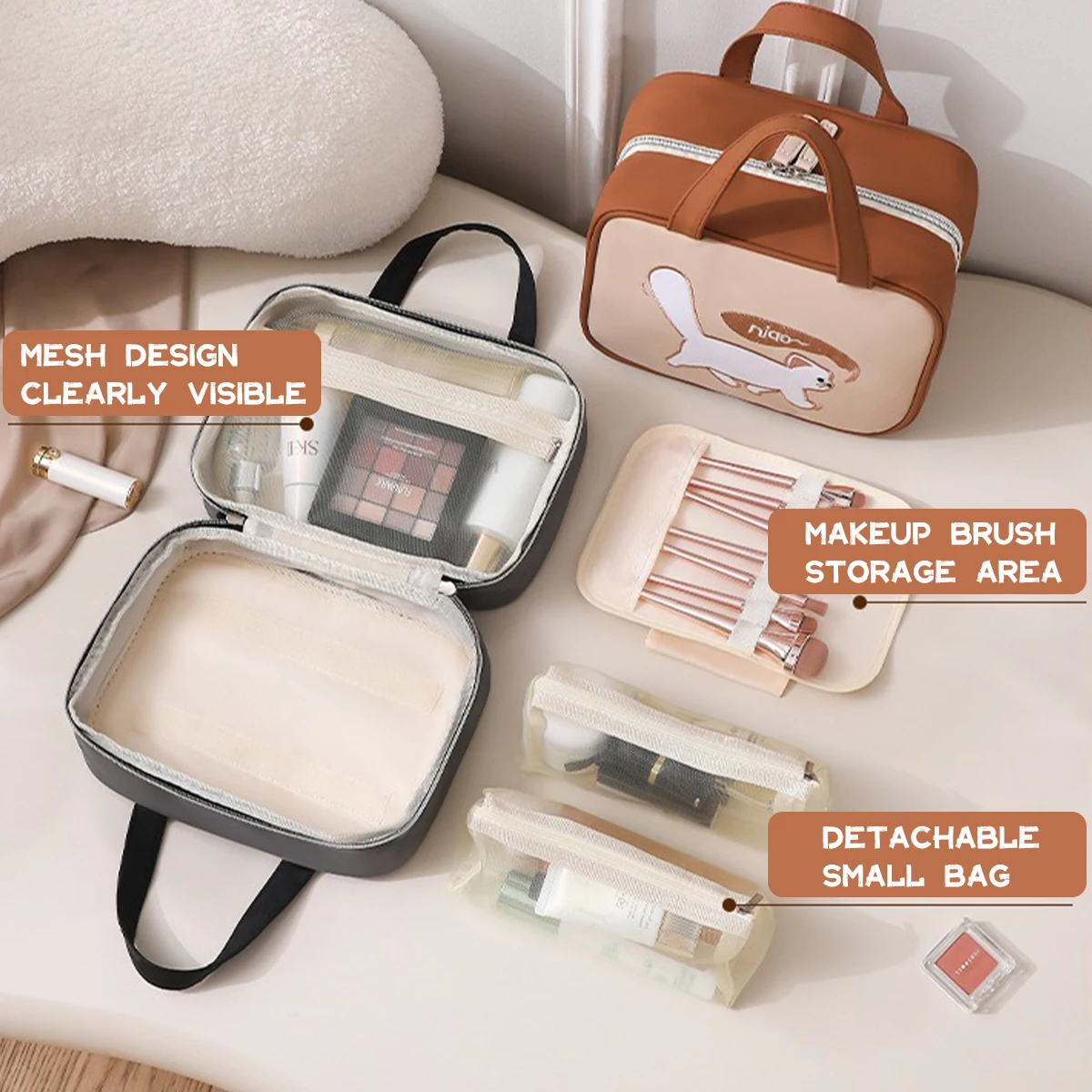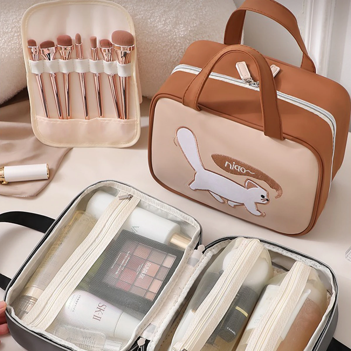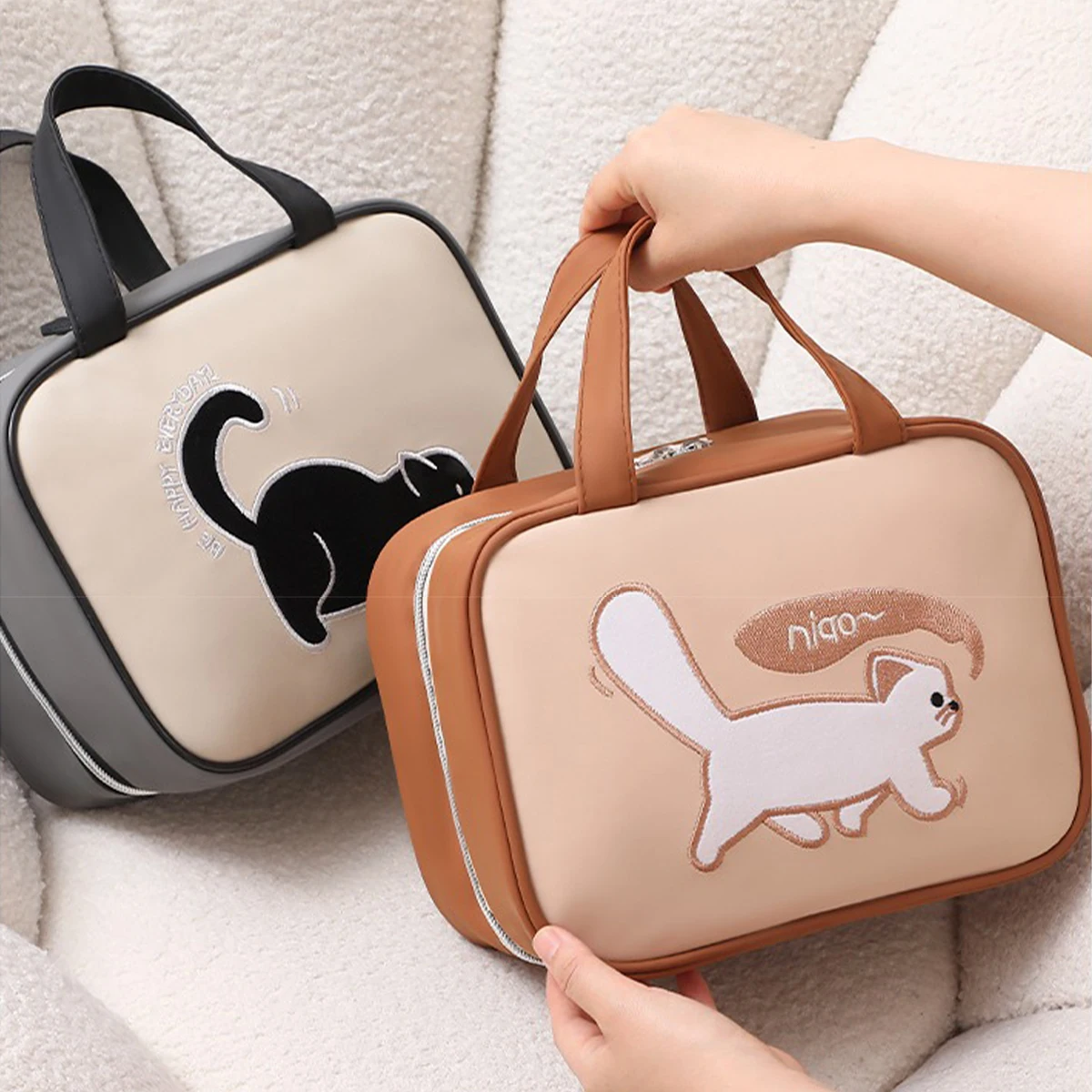 Organiza tu rutina de belleza con estilo y ternura. El Neceser Katze de Selvara está diseñado para acompañarte en viajes, escapadas y en tu día a día, manteniendo todo tu maquillaje y productos de cuidado personal perfectamente ordenados. Fabricado en PU de alta calidad, es resistente, fácil de limpiar y mantiene su forma incluso cuando va lleno. Su diseño de gatito le da un toque dulce y original que destaca en cualquier tocador o maleta. En su interior encontrarás múltiples compartimentos con cierres y mallas transparentes que facilitan la organización y la visibilidad de todos tus productos. Además, sus asas superiores permiten transportarlo con total comodidad.
